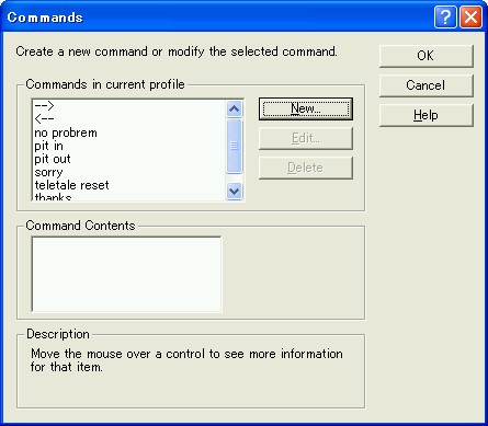 Newボタンをクリックして登録。 コマンド識別用の名前と、Record ボタンをクリックして実際のキー操作を行って登録します。この例では、GPL用に「Pit Out」チャット発言用に「Enter押す」「Enter離す」「P 押す」「P 離す」「O 押す」「O 離す」「Enter押す」「Enter離す」としています。