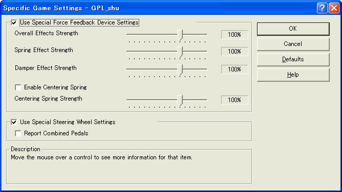 このゲームのFFB強さ、センタリング有無及び強さ、ペダル軸設定を特に設定する場合は、Use Special Settingsにチェックして設定します。