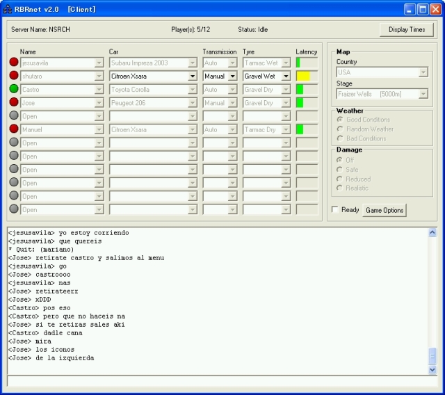 サーバを起動したり、サーバに接続したら、RBRnet 2.0のクライアント画面が表示されます。Latencyけっこう高いですが、接触があるわけではないので問題はありません。