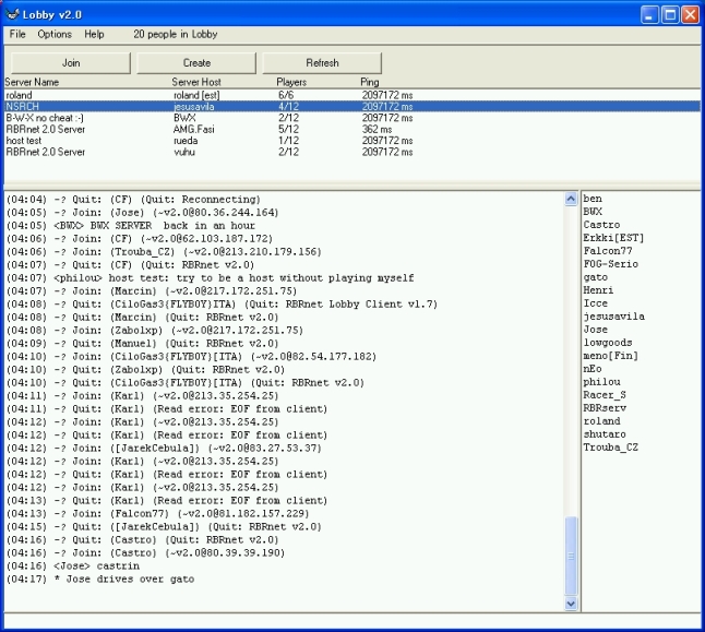 RBRnet2.0.exeではなく、Lobby2.0.exeを使えば、ToCA EDITが提供しているロビーへ接続して、公開されたサーバを探したり、ロビーでチャットしたりできます。