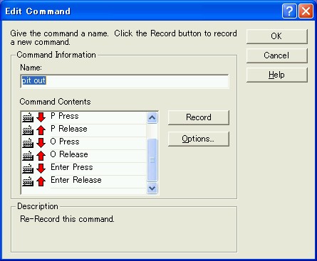 Newボタンをクリックして登録。 コマンド識別用の名前と、Record ボタンをクリックして実際のキー操作を行って登録します。この例では、GPL用に「Pit Out」チャット発言用に「Enter押す」「Enter離す」「P 押す」「P 離す」「O 押す」「O 離す」「Enter押す」「Enter離す」としています。