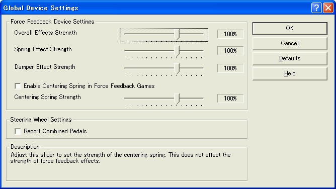 FFB強さと、センタリング有無及び強さ、ペダルの1軸化設定(チェックしなければ2軸)。