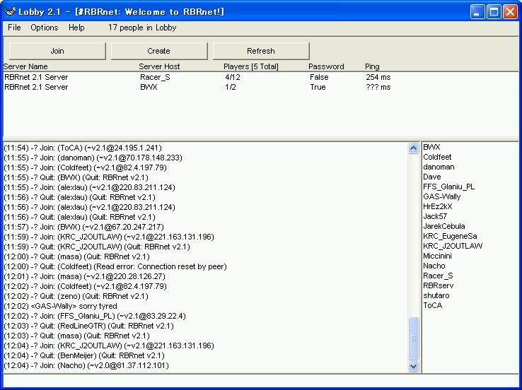 RBRnet.exeではなく、Lobby.exeを使えば、ToCA EDITが提供しているロビーへ接続して、公開されたサーバを探したり、ロビーでチャットしたりできます。