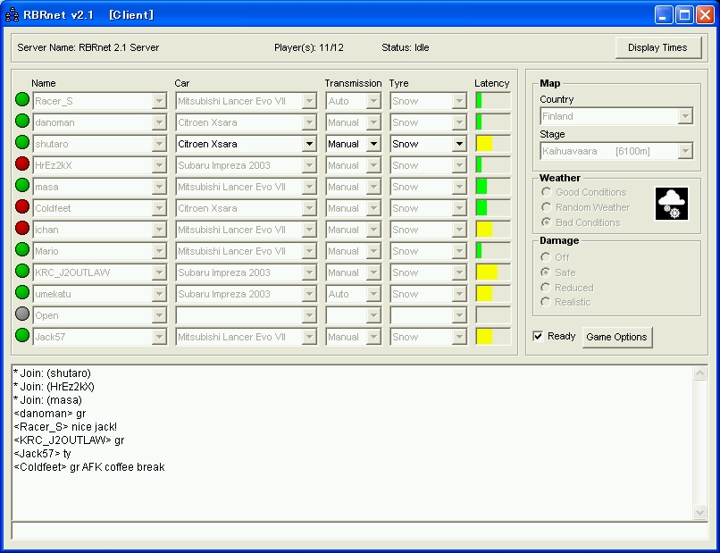 サーバを起動したり、サーバに接続したら、RBRnet 2.xのクライアント画面が表示されます。Latencyけっこう高いですが、接触があるわけではないので問題はありません。